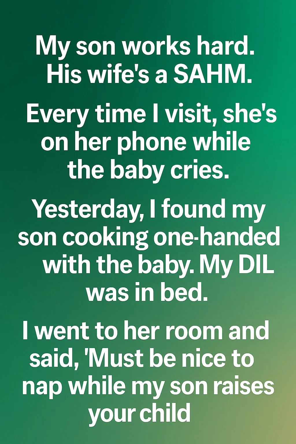 Everything came to a head on a perfectly ordinary evening. I saw my son multitasking with the baby and felt a surge of indignation on his behalf. In that moment, my concern for him blinded me to anything else. I spoke words to my daughter-in-law that were born of this narrow view, words that accused her of luxury while she was actually in captivity. The wounded silence that followed my outburst was more powerful than any argument. It was the silence of someone who had been misunderstood at the most fundamental level.