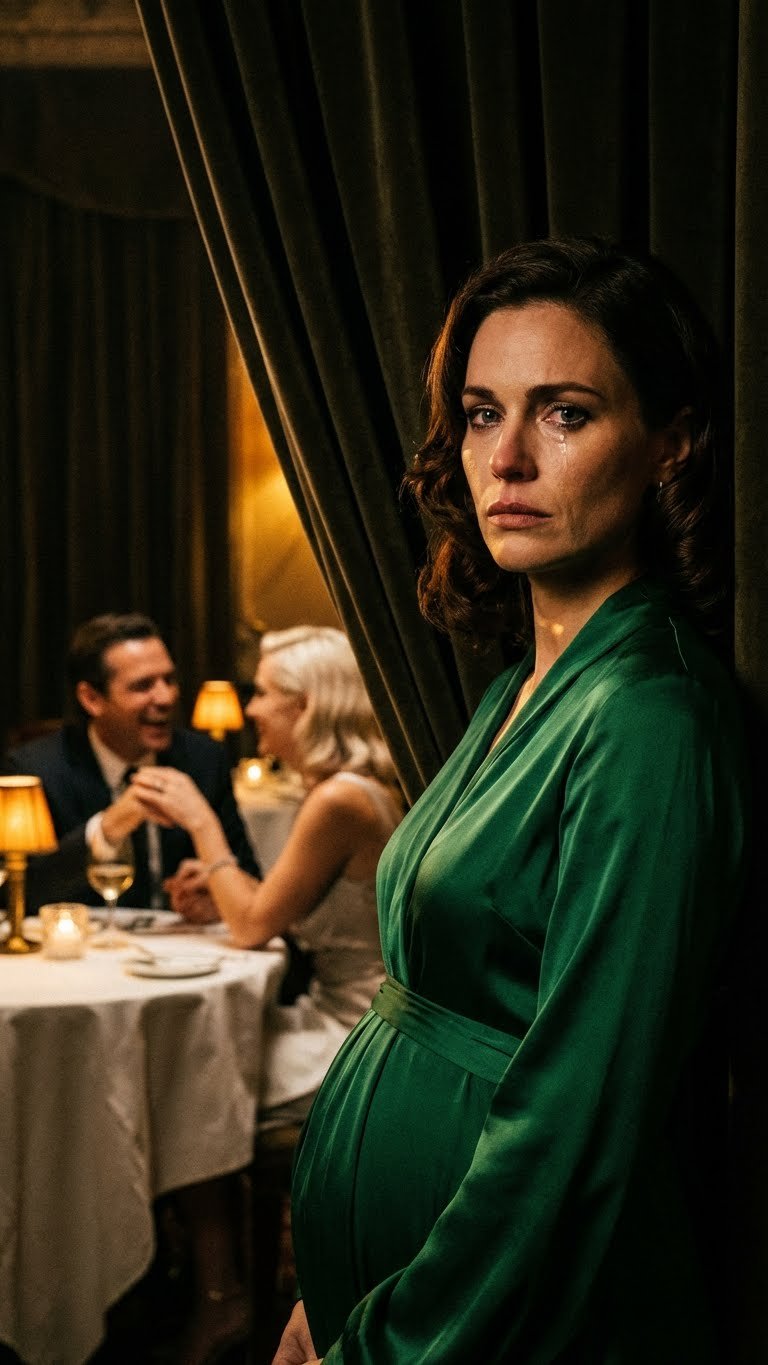 The silence was absolute. I walked out from behind the orchids, my emerald dress flowing around my swollen form. I placed a hand on my back, accentuating the pregnancy, and walked slowly toward their table.