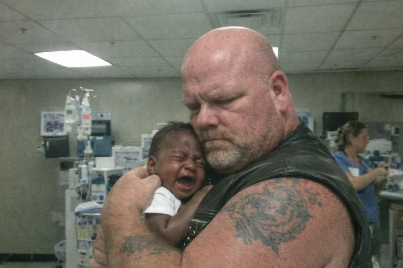 The fluorescent lights of the emergency room hummed with a sterile, cold tension that mirrored the panic in my chest. My three-month-old daughter, Emma, had been screaming for hours, her fever spiking to a dangerous 102 degrees while Sarah and I felt our world collapsing from sheer exhaustion. I was on the edge, my judgment clouded by three months of sleepless nights and the raw, piercing sound of colic that felt like it was drilling into my skull. When a large man in a weathered leather vest stepped into that crowded waiting room, his heavy boots echoing against the linoleum, I didn’t see a father; I saw a threat.